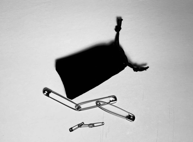 Three safety pins link and unlink. Even toss one and it links! At the end the 3 large pins are tossed into your hand, and have shrunk to 3 linked mini pins!